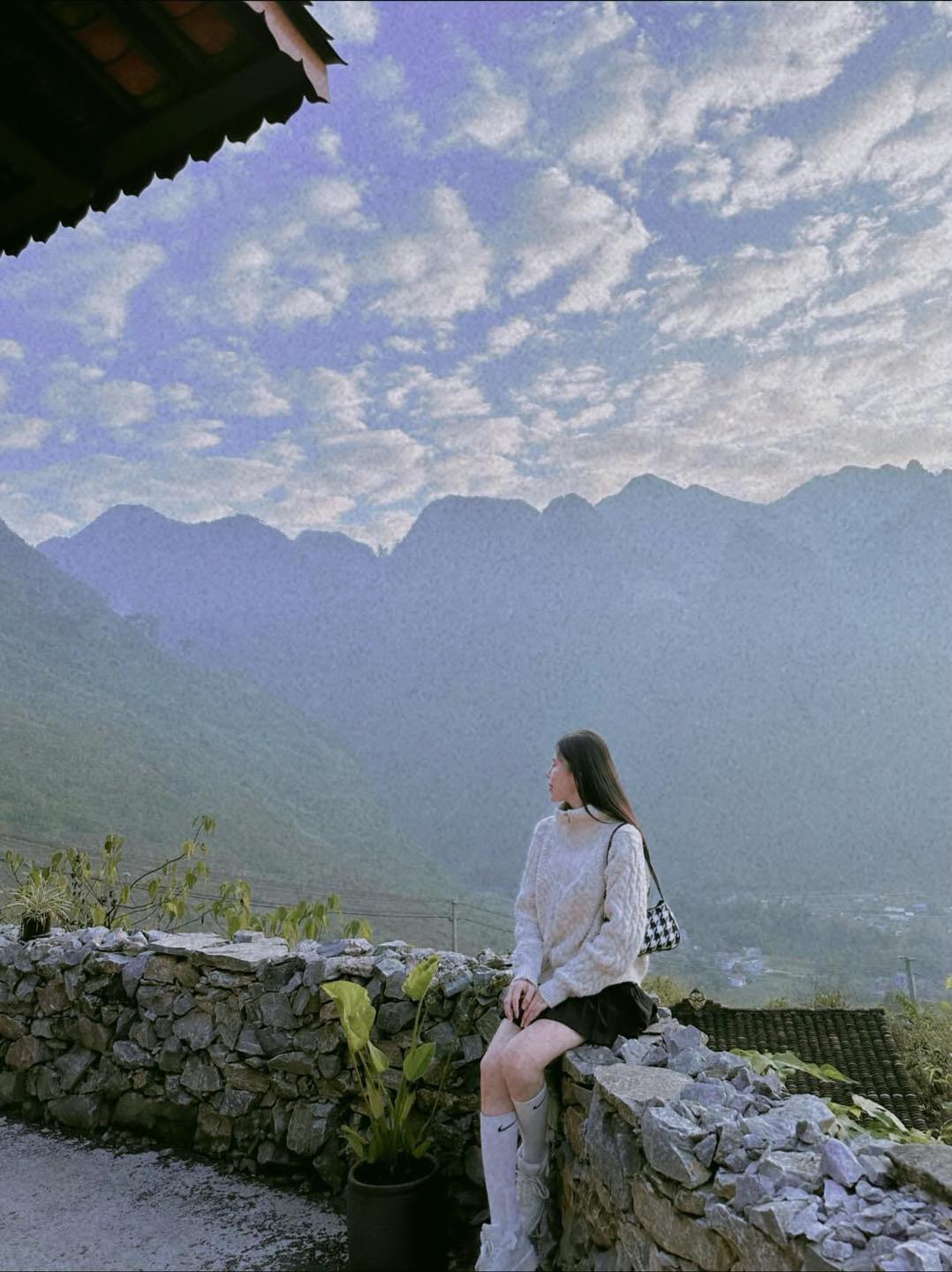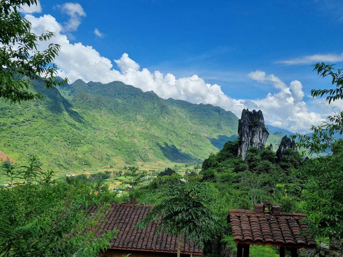 Bungalow đơn được xây dựng theo kiến trúc nhà trình tường truyền thống của người Mông, lợp mái ngói âm dương, bao quanh bởi hàng rào đá và vườn...