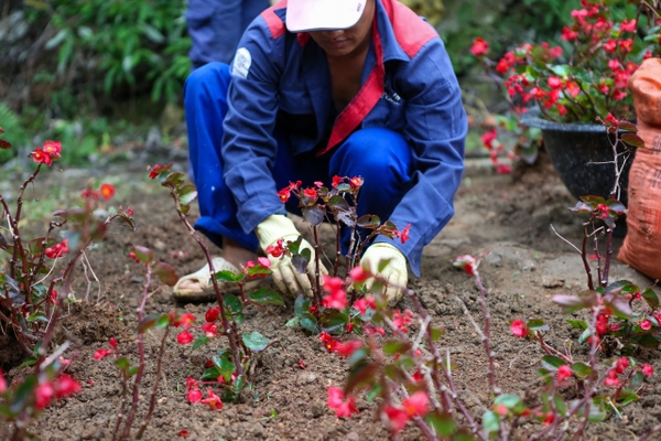Nhân viên của H'mong Village đang trồng thêm hoa mới ở vườn.