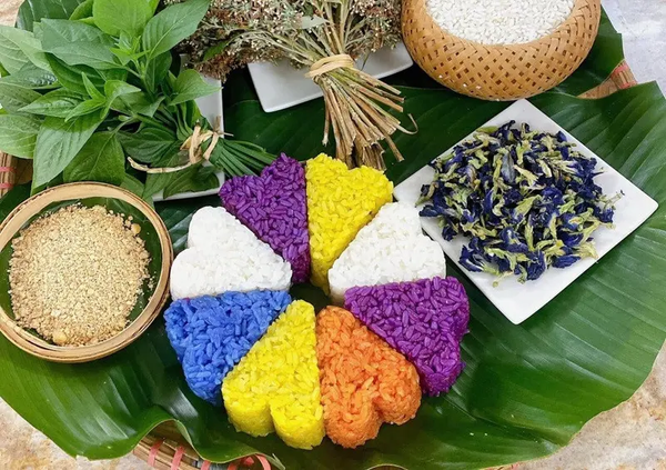Xôi ngũ sắc là món ăn truyền thống của dân tộc Tày. Gạo nếp nương được nhuộm màu hoàn toàn từ nguyên liệu tự nhiên như gấc, nghệ, lá gừng, lá cơm đen… Không chỉ đẹp mắt, món xôi này còn mang ý nghĩa về ngũ hành, cầu mong may mắn, đủ đầy.