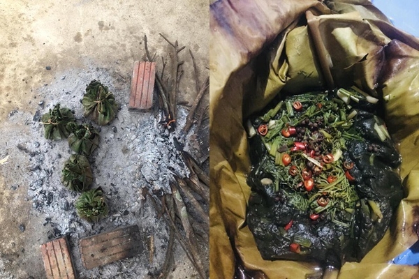 Rêu nướng là món ăn truyền thống của người Tày. Rêu suối non được làm sạch, trộn gia vị rồi gói lá dong nướng trên than hồng.