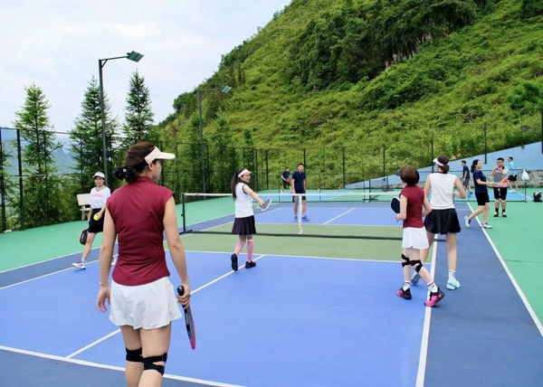 Ảnh: Các đoàn khách giao lưu pickleball tại sân pickeball của H'mong Village.
