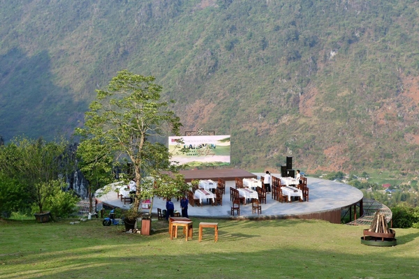 Nhà hàng trung tâm sức chứa hàng trăm khách, phục vụ thực đơn đa dạng từ món Âu đến ẩm thực Hà Giang đặc trưng như thắng cố, gà đen, cá suối nướng, lợn cắp nách, rượu ngô men lá.