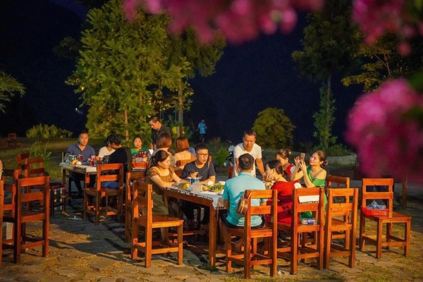 Ảnh: Du khách thưởng thức bữa tối tại sân nhà hàng của H'mong Village
