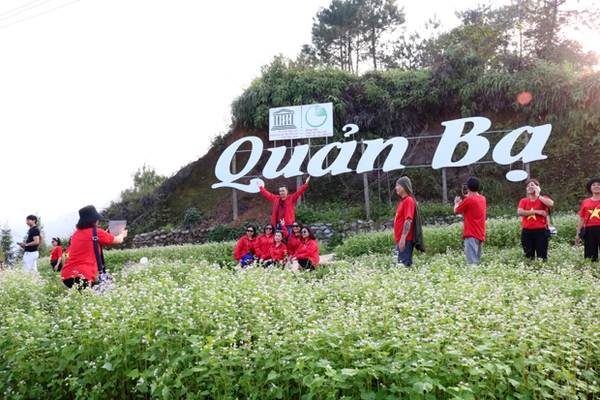 Ảnh: du khách tham quan vườn hoa tam giác mạch tại Quản Bạ