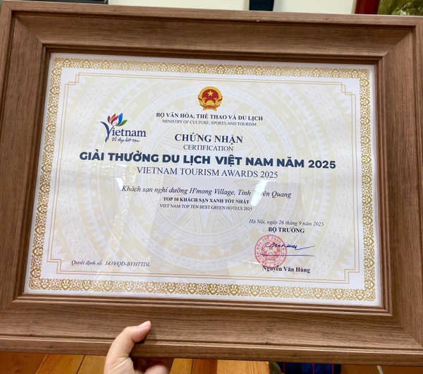 Ngày 27/9/2025, tại Hà Nội, trong khuôn khổ Lễ trao Giải thưởng Du lịch Việt Nam 2025 – sự kiện thường niên uy tín hàng đầu của ngành du lịch cả nước, H’mong Village Hà Giang đã vinh dự nhận giải thưởng “Khách sạn Xanh tốt nhất”. Đây là một trong những hạng mục quan trọng, ghi nhận những khách sạn tiên phong trong việc bảo vệ môi trường, phát triển du lịch bền vững và gìn giữ bản sắc văn hóa địa phương.