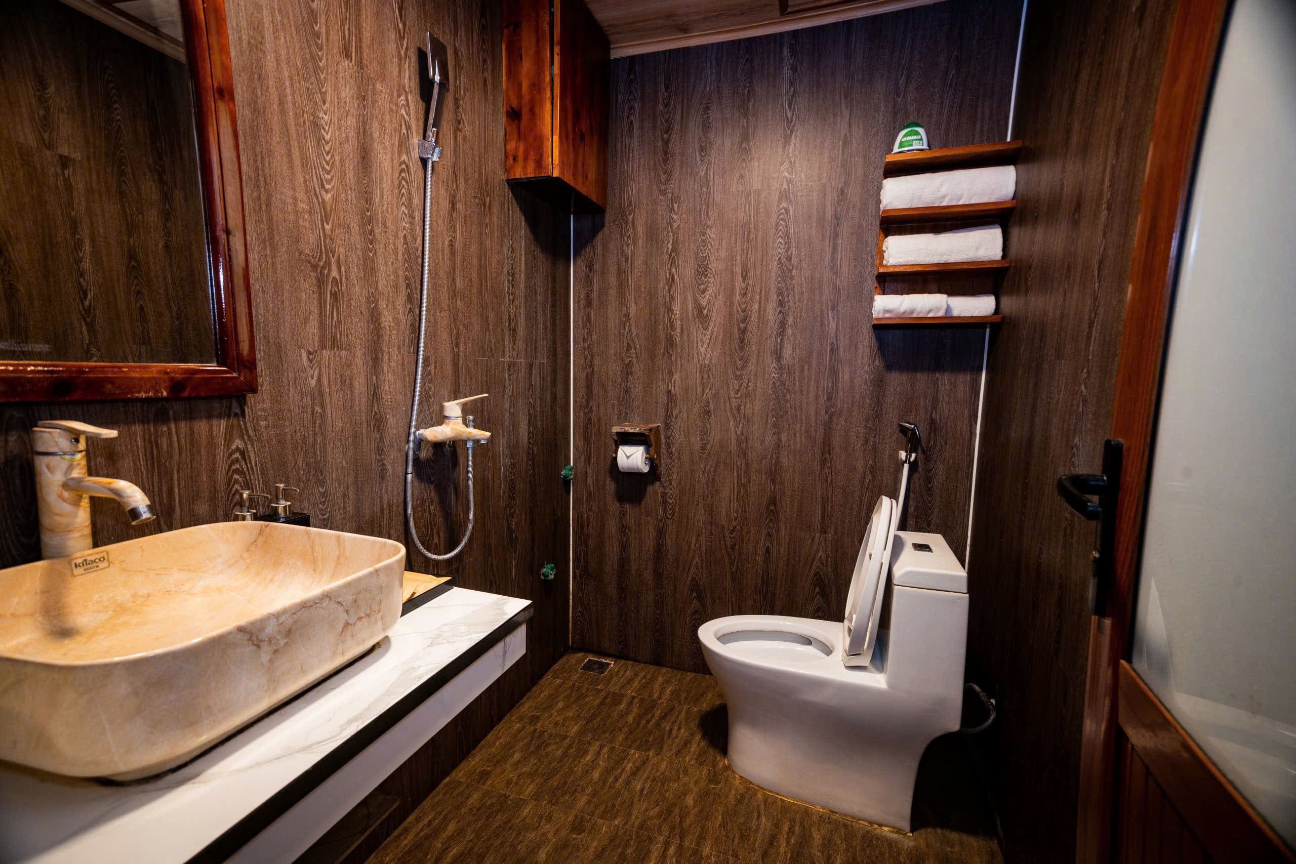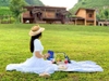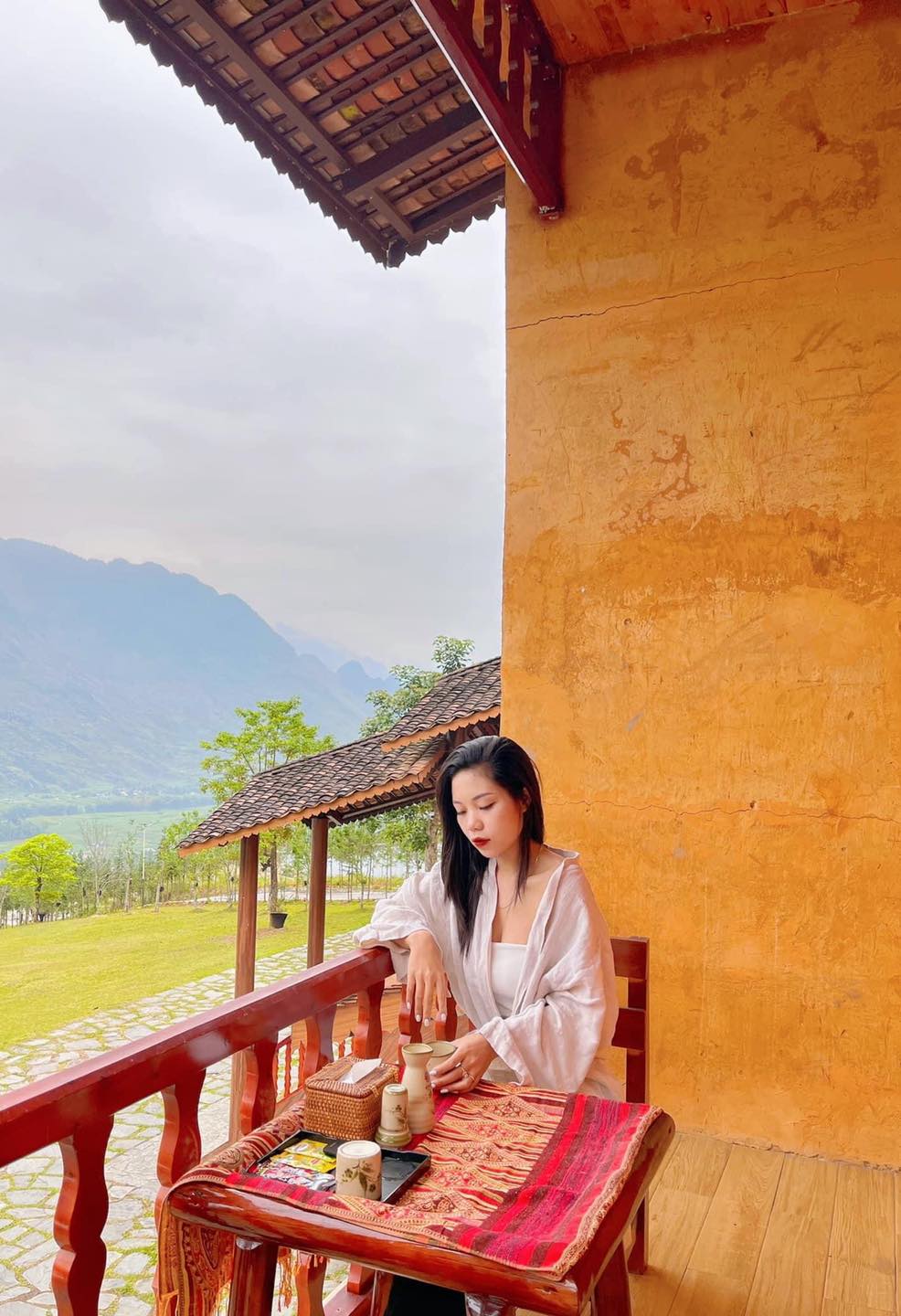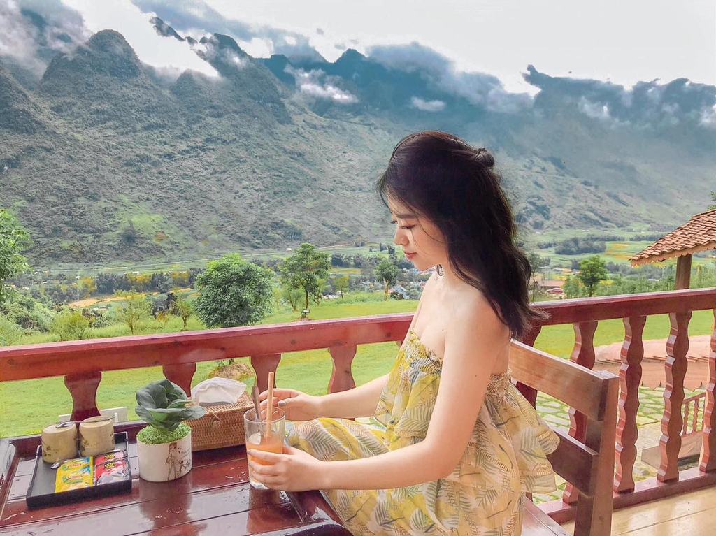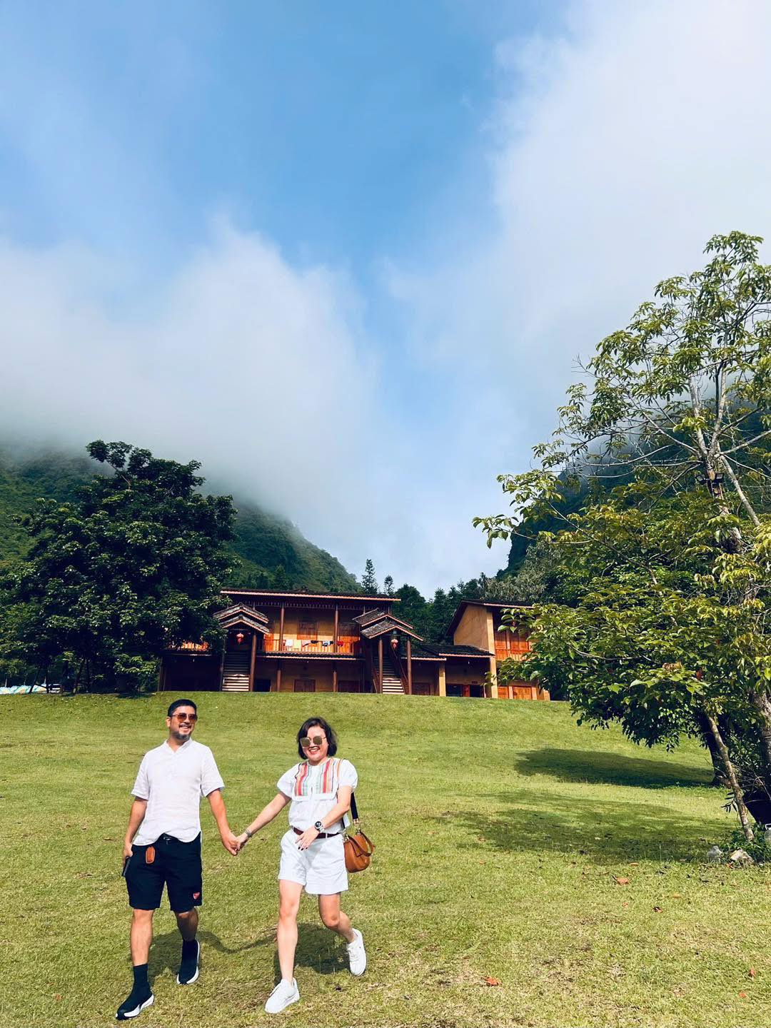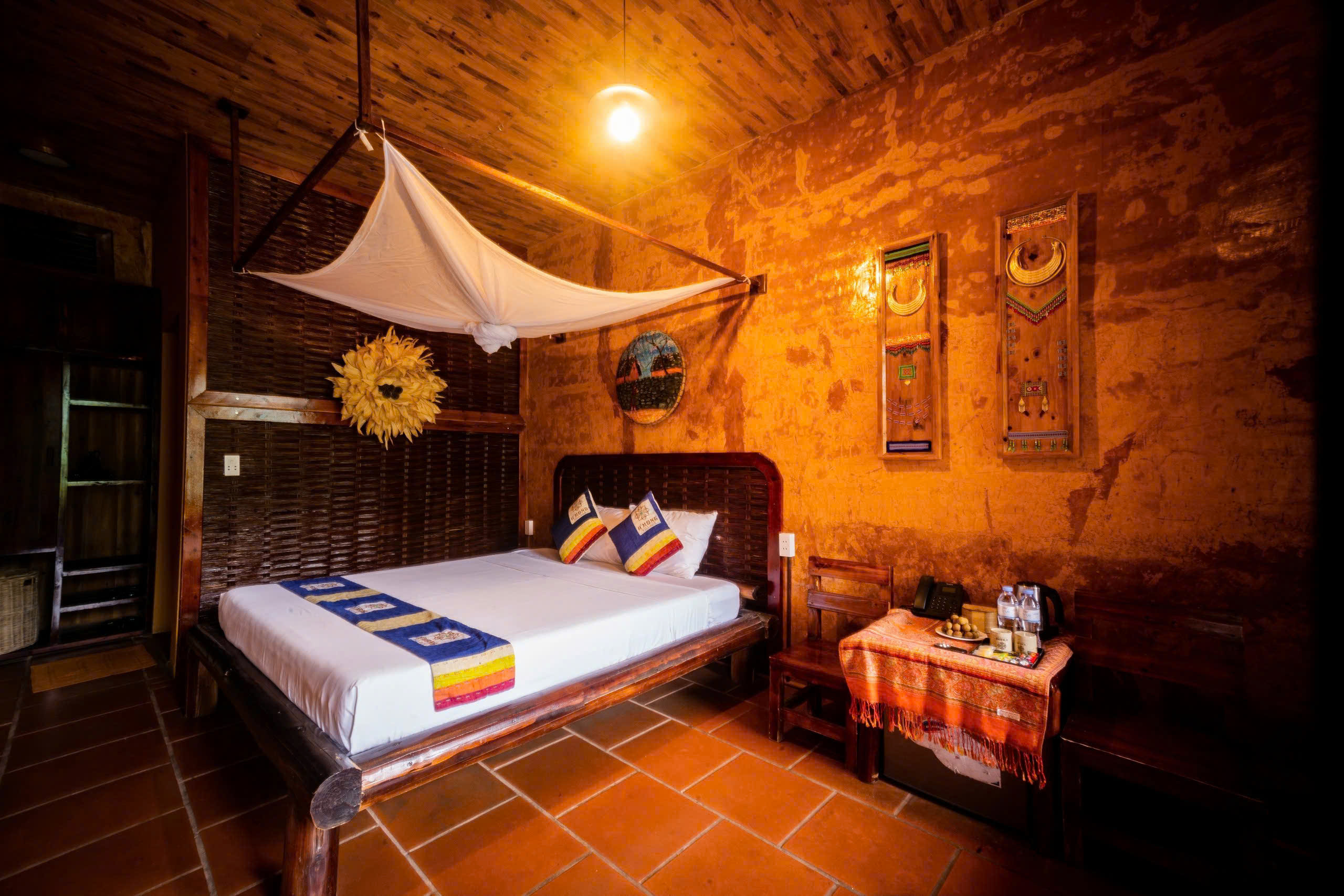 Bungalow đơn được xây dựng theo kiến trúc nhà trình tường truyền thống của người Mông, lợp mái ngói âm dương, bao quanh bởi hàng rào đá và vườn...