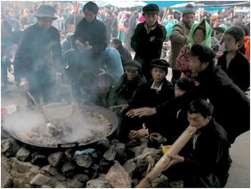Cạnh khu mua bán là khu vực hàng ăn với những chảo thắng cố to, nóng hôi hổi cùng những chai rượu ngô thơm nồng. Bên cái bàn thấp tè, dăm cái ghế băng cũ kỹ, thắng cố được múc ra, rượu ngô rót đầy bát, những người đàn ông ăn thắng cố, uống rượu ngô; còn đàn bà ngồi cạnh chờ chồng, trò chuyện, đôi tay mải miết se sợi. Người Mông đi chợ cũng là chơi chợ. Do đặc thù vị trí địa lý, mỗi nhà cách nhau đến cả quả núi nên chợ là nơi giao lưu, gặp gỡ.